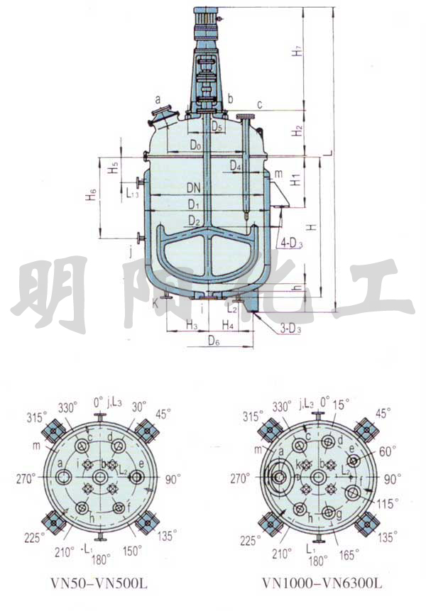 | a 手孔 人孔 Hand/Man Hole | b 搅拌孔 Agitating Hole | c 测温孔 Themometer Hole | d 备用孔 Spare Hole | e 备用孔 Spare Hole | f 备用孔 Spare Hole | g 备用孔 Spare Hole | h 备用孔 Spare Hole | i 放料孔 Discharging Hole | k 进(出)孔 Inlet(Outet) Hole | m 放气孔 Exhaust Hole | L1、2、3 进(出)孔 Inlet(Outet) Hole | J 进(出)孔 Inlet(Outet) Hole | |